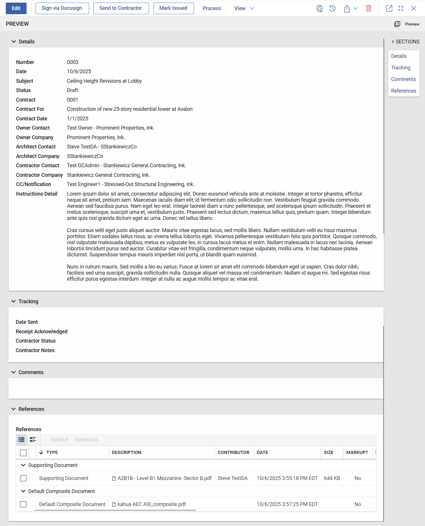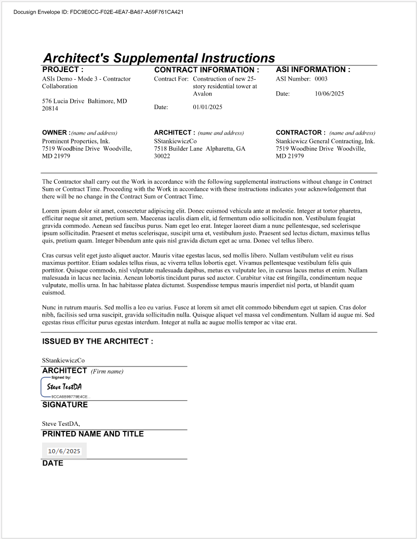 Mode 2 – DocuSign: Enable seamless digital signing with Kahua’s DocuSign integration. Authors can route draft ASIs for official signature directly through DocuSign. Once signed, the ASI is automatically returned and attached to the original Kahua record. Distribution can then be managed and logged manually.