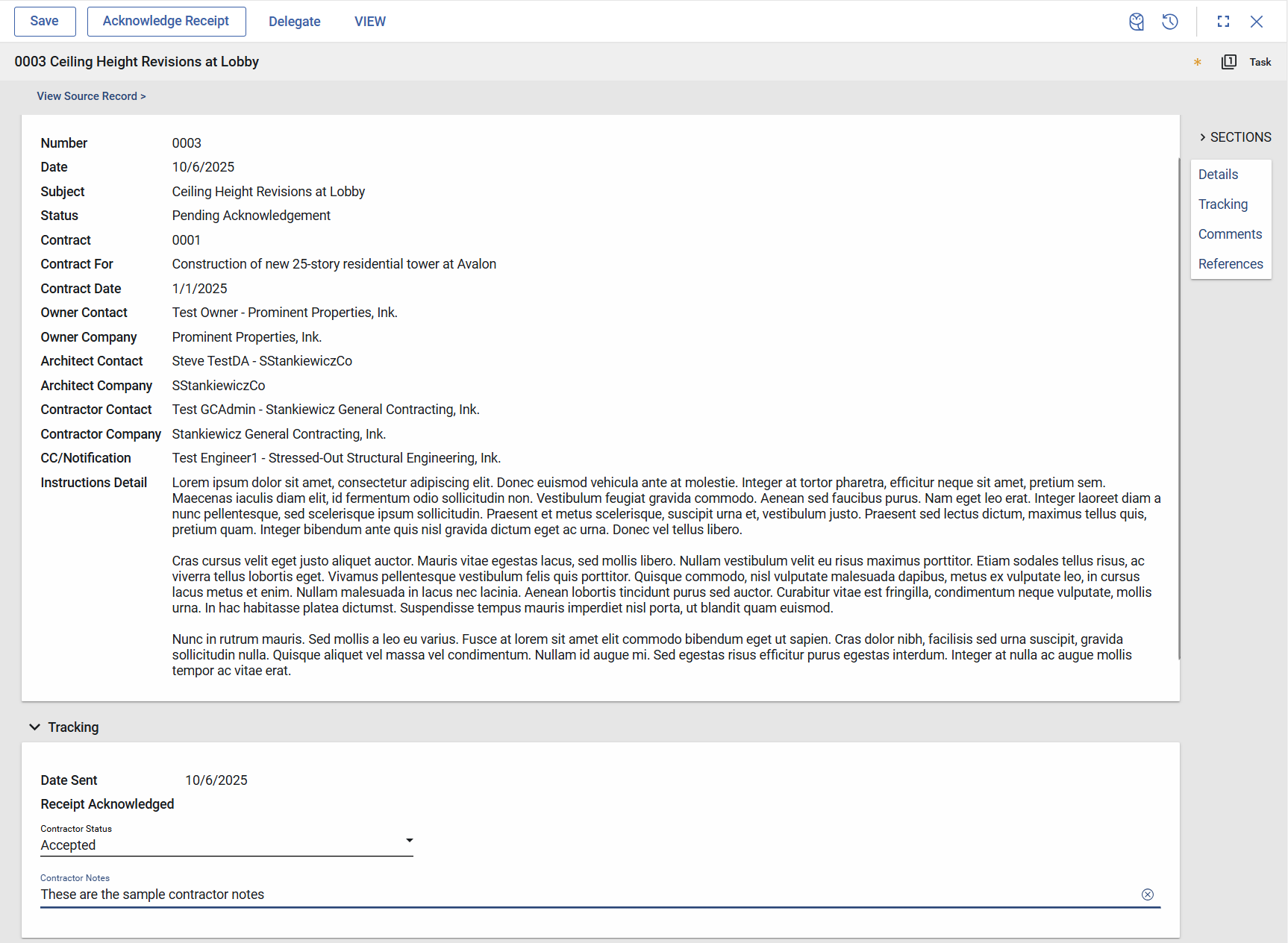 Mode 3 – Collaborative: Activate Kahua’s Contractor Workflow to collaborate directly with contractors. Send the completed ASI via a Kahua Task, allowing the recipient to select a contractor status or disposition, add notes, and officially confirm receipt — automatically updating the source record in real time.