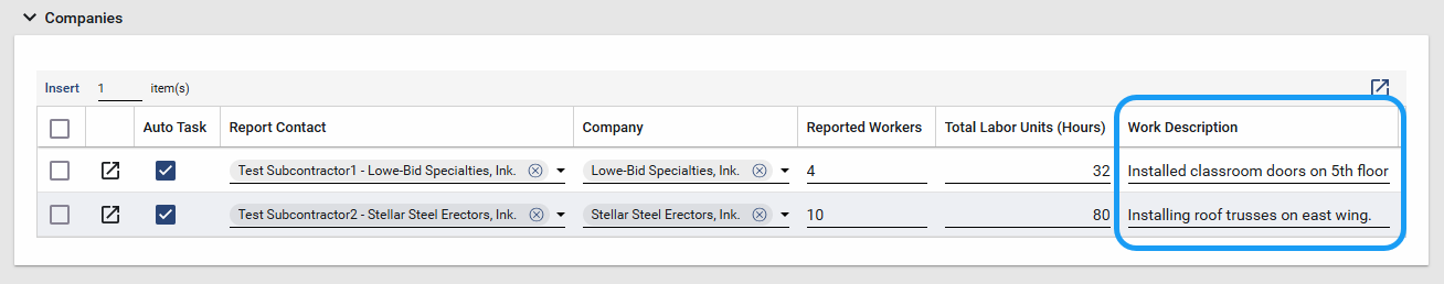 To help streamline daily report entry in Kahua, the Work Description field in the Companies grid is now directly editable.