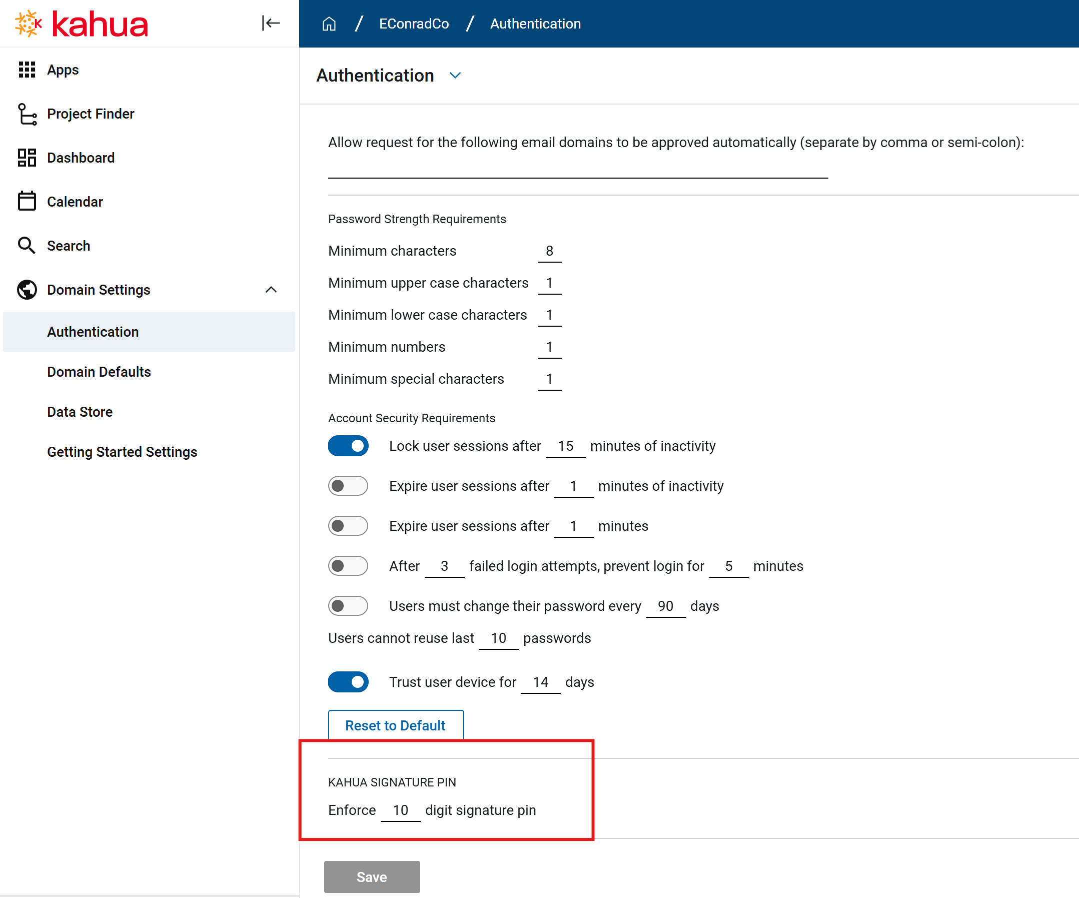 To modify the PIN length, navigate to Domain Settings > Authentication > Kahua Signature PIN.