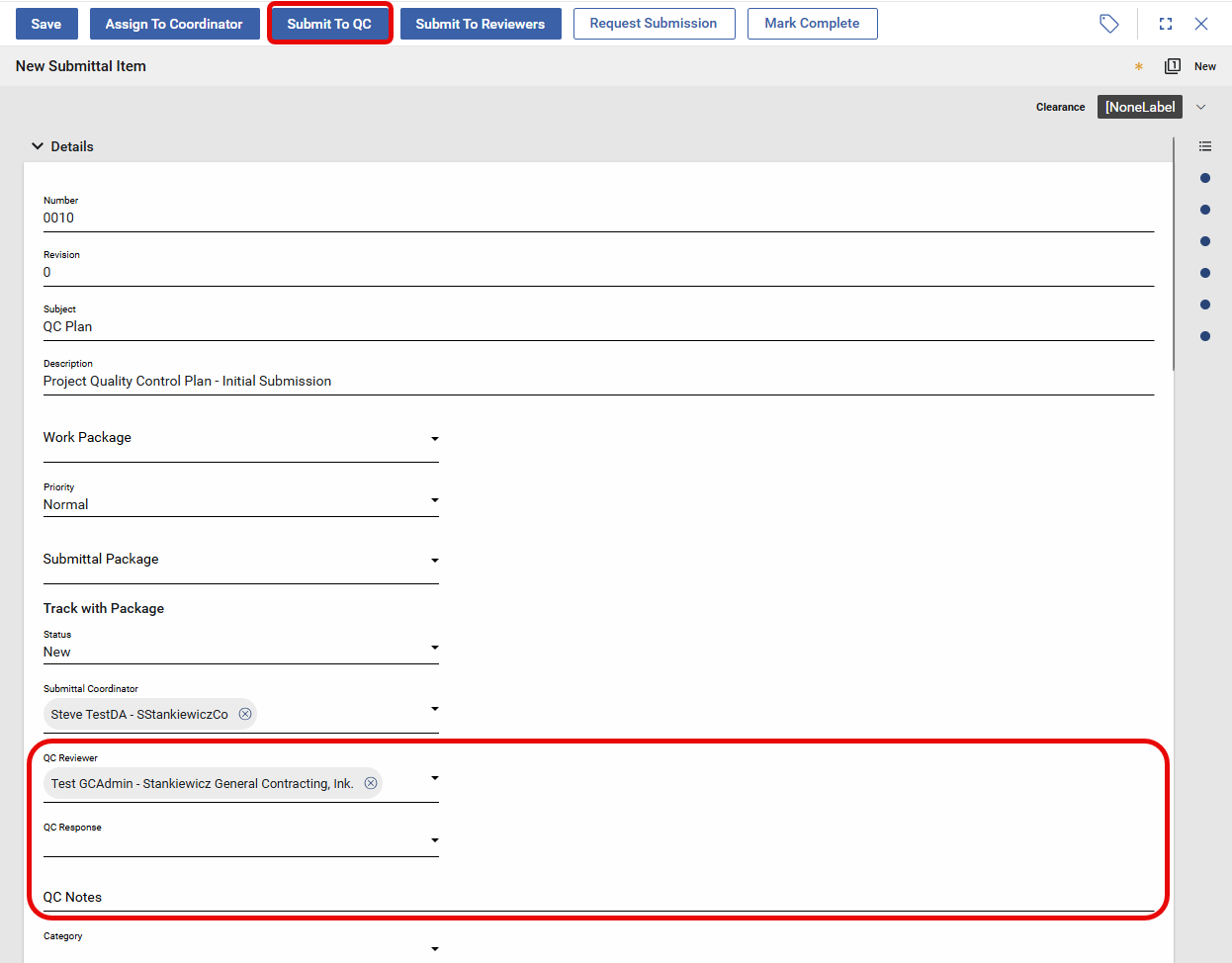 Edit any fields on the submittal, including two new QC-specific fields:
