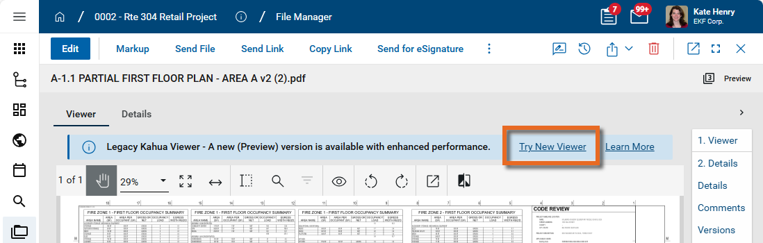At this time, some viewer functionality is not available in the preview of the new File Viewer. You can switch back and forth between the viewers by selecting Switch to Legacy Viewer or Try New Viewer. Your selection is retained while you are logged in to Kahua.