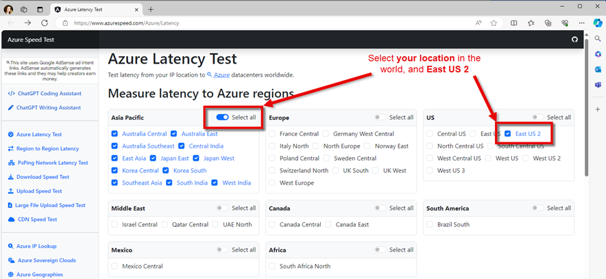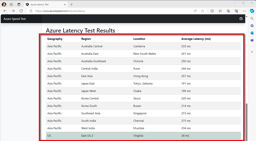 Open this webpage - https://www.azurespeed.com/Azure/Latency. This website that measures the time it takes to send data from your IP address location to Azure datacenters worldwide. At the top of the page, you will select the regions to measure latency from, and the results will appear below those selections.