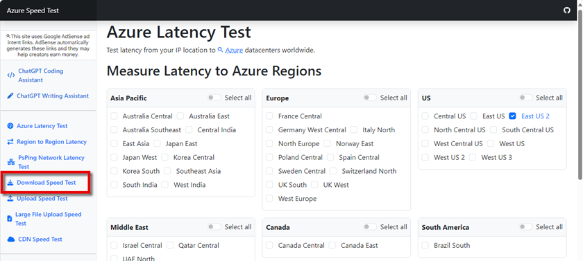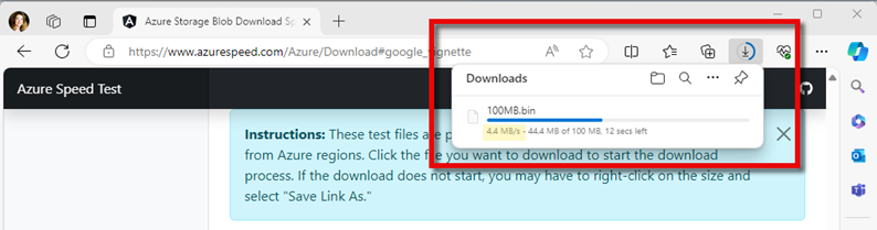 Open this webpage - https://www.azurespeed.com/Azure/Download. Note that you can also select Download Speed Test from the left navigation bar after you complete the latency test in the previous section.