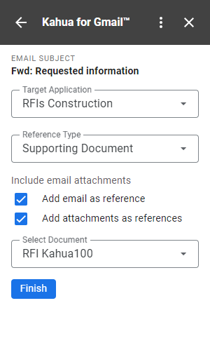 If you selected only Send To My Messages or Copy to Communications, select Finish to copy the email message or conversation to Kahua.