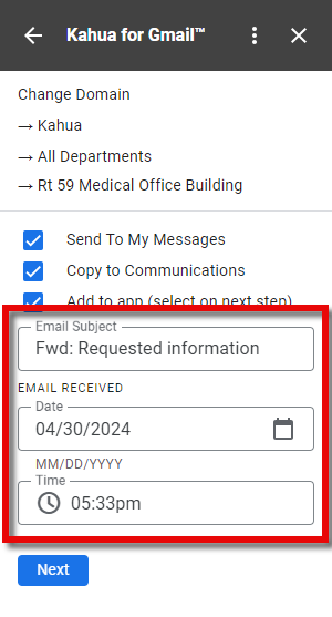 The Email Subject, Date and Time received appear here, copied from the email. These values can be edited. These fields will appear on the record in Kahua.