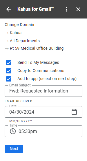 If you selected Add to app, you must click Next to select the appropriate application and record to associate the email with.
