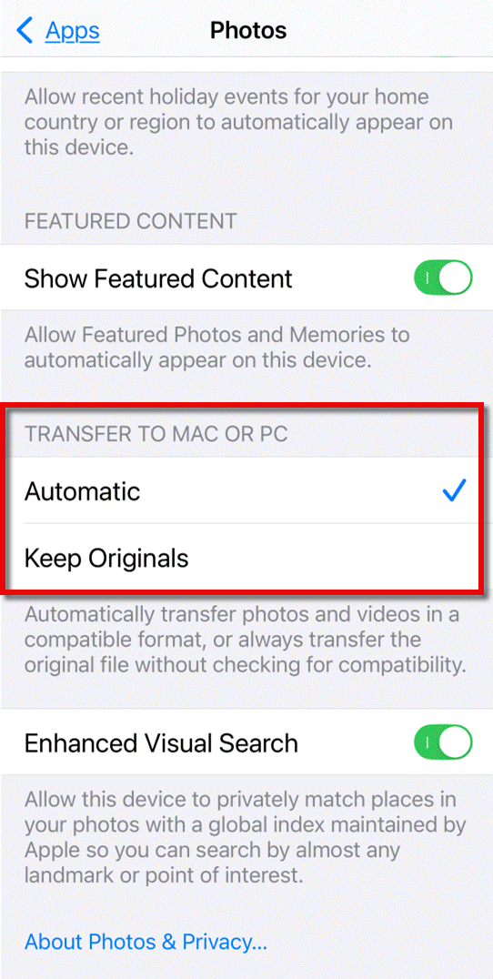 However, if the receiving device can handle HEIC files, the files may not be converted upon transfer. If so, you may want to modify your settings to store images on your iOS device as JPG files.