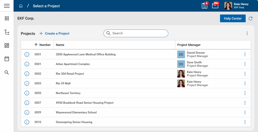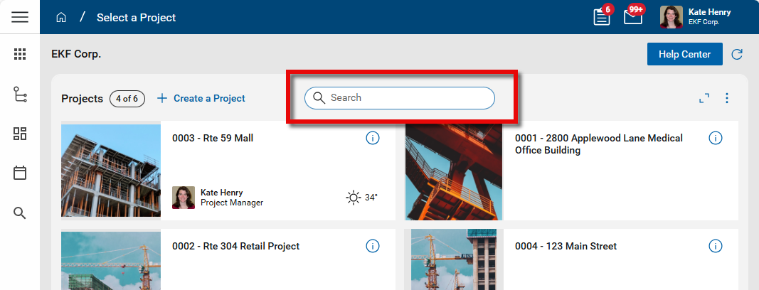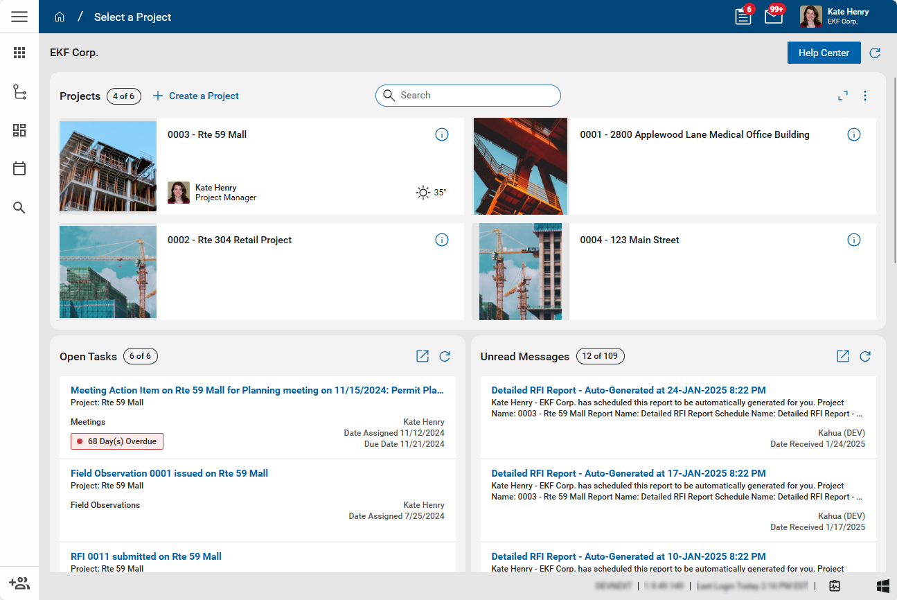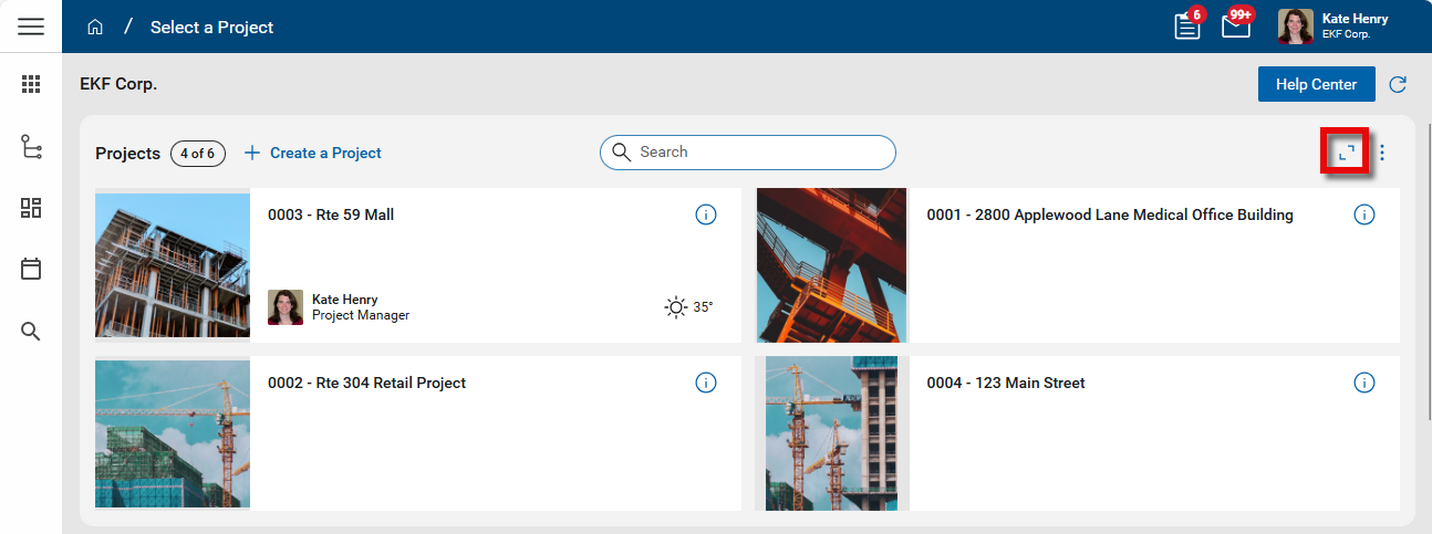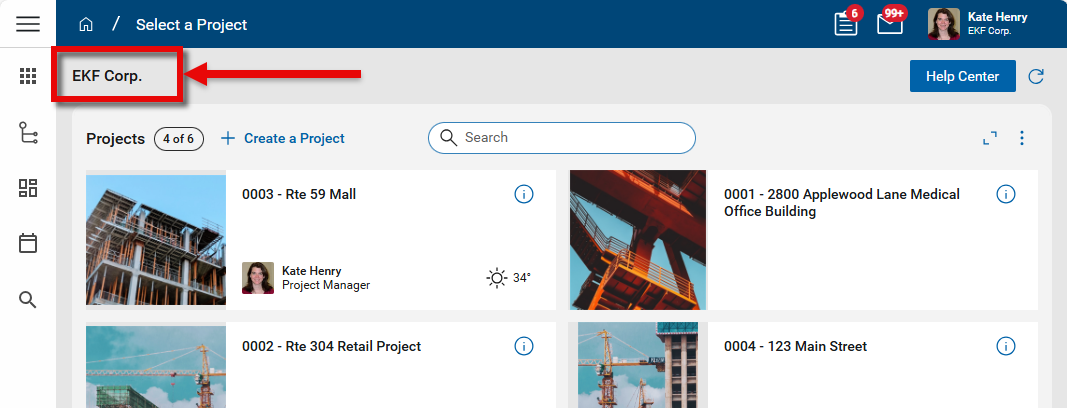 Just below the header, you'll see the name of your currently selected domain and the Help Center button. The Help Center button opens either Kahua's support page or a help page specific to your organization.