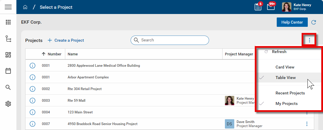 The projects can appear as widgets in the card view, or in a list in the table view. To switch between views, click on the More menu icon