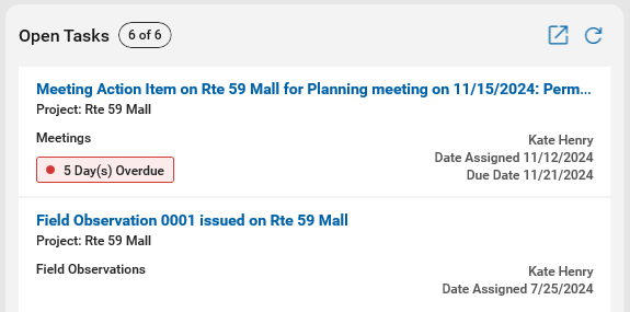 The twelve most recent tasks assigned to you that are not yet complete appear in the Open Tasks section. The total number of open tasks appears in the header. Overdue items are flagged with a tag.