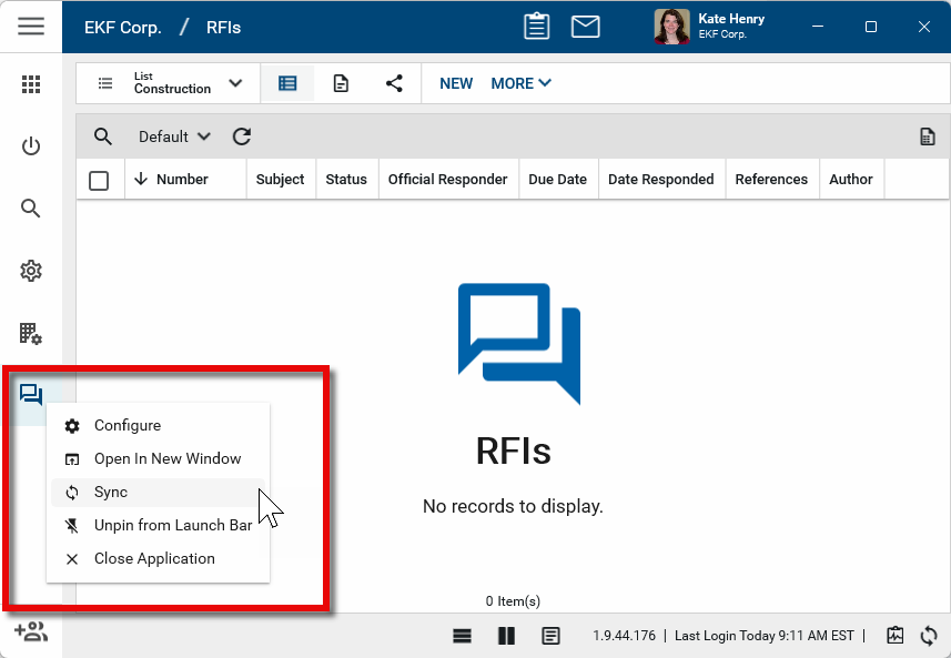 The launch bar is where you will go to access most of the applications in Kahua. From the launch bar you can open and close applications, pin them to make them more easily accessible, determine which application appears when you first open Kahua, and access any application-specific help videos or documentation your organization has made available to you. Additionally, you can expand or collapse the launch bar itself.