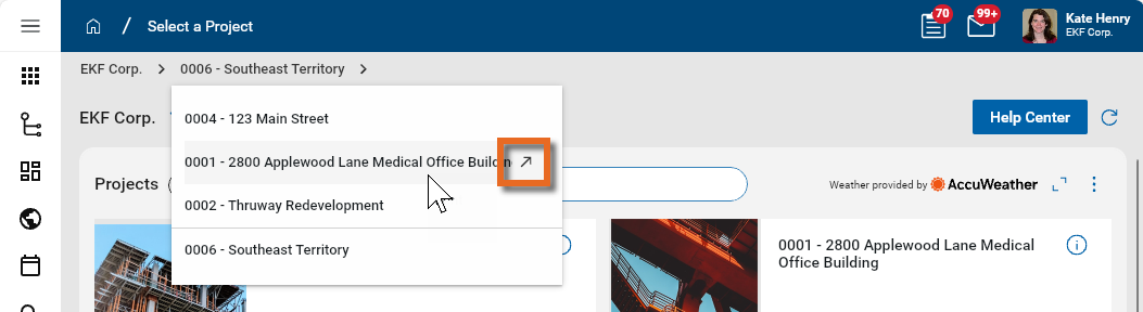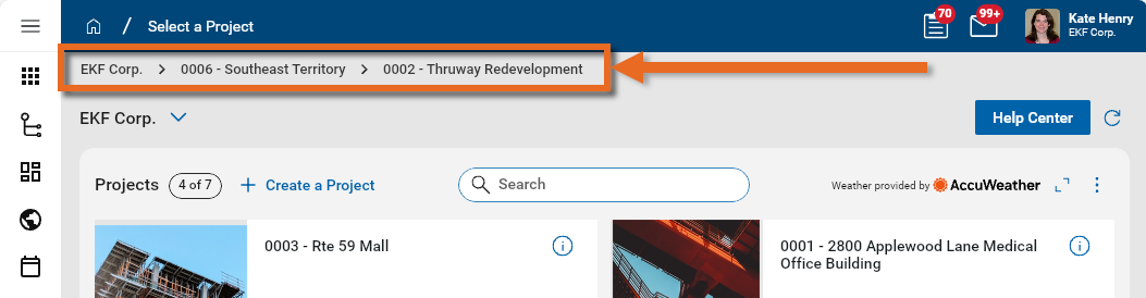 If enabled in your user settings, a persistent navigable project breadcrumb appears just below the header as you navigate Kahua.