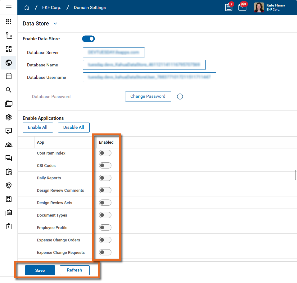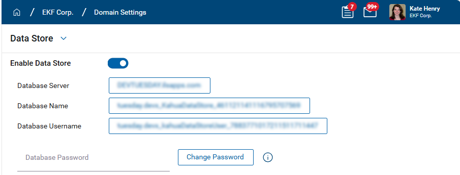 Enabling the data store can be done from within Kahua by any domain administrator. The Kahua data store provisions the creation of a domain specific database which can be used for various reasons.
