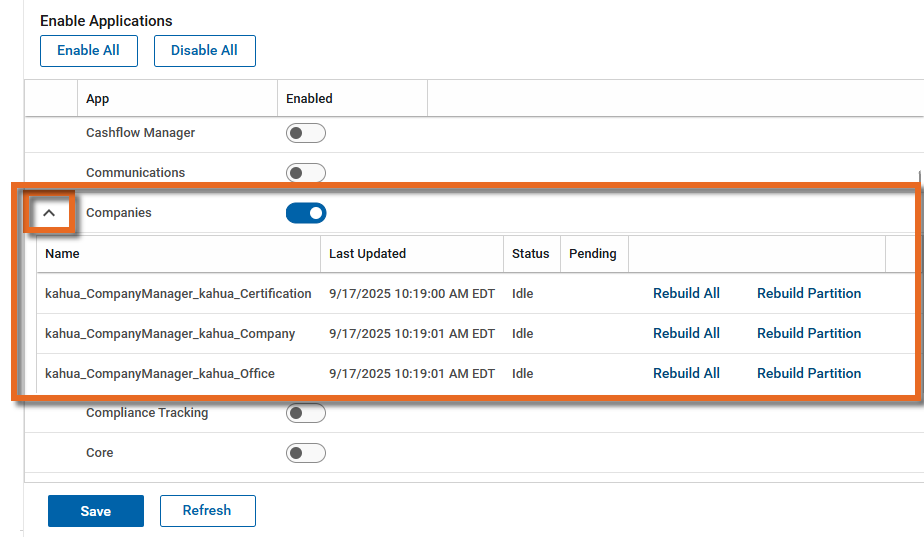 Click Save when you are done. On save, Kahua creates tables in the data store for the selected applications and populates them with data from Kahua.