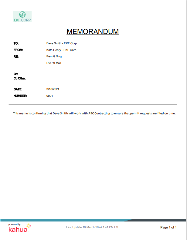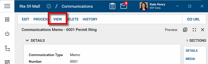A portable view (PV) is a PDF version of a single Kahua record such as a letter, RFI, or contract. The base Kahua environment includes built-in portable views for each app. You can access the portable view by opening the detail view of the item and selecting View.