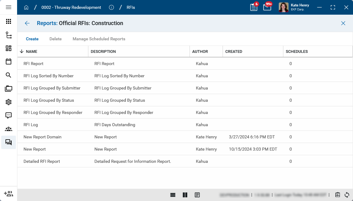 Reports are available in most applications in Kahua. Most applications have built-in reports available. Users with the appropriate permissions can create new reports for themselves or to be used by others in the organization. For information on creating reports, refer to Creating ad hoc reports.