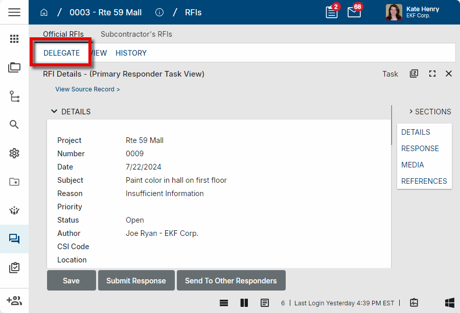 Select the user to delegate the task to. When manually delegating a task that originated in another domain, you can only delegate it to a Kahua user in the domain the task originated from.