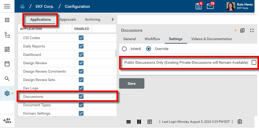 Select or clear the Public Discussions Only (Existing Private Discussions will Remain Available) setting. When enabled, users will not have the option to make a new discussion private. Any private discussions created before the setting is updated remain private.