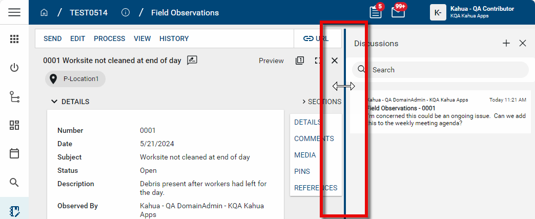 next to the record name to open the discussions panel. Note that you can modify the width of the discussion panel by hovering over the left edge and adjusting its location. -