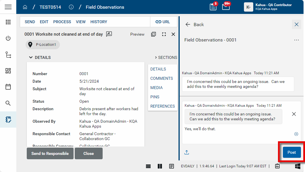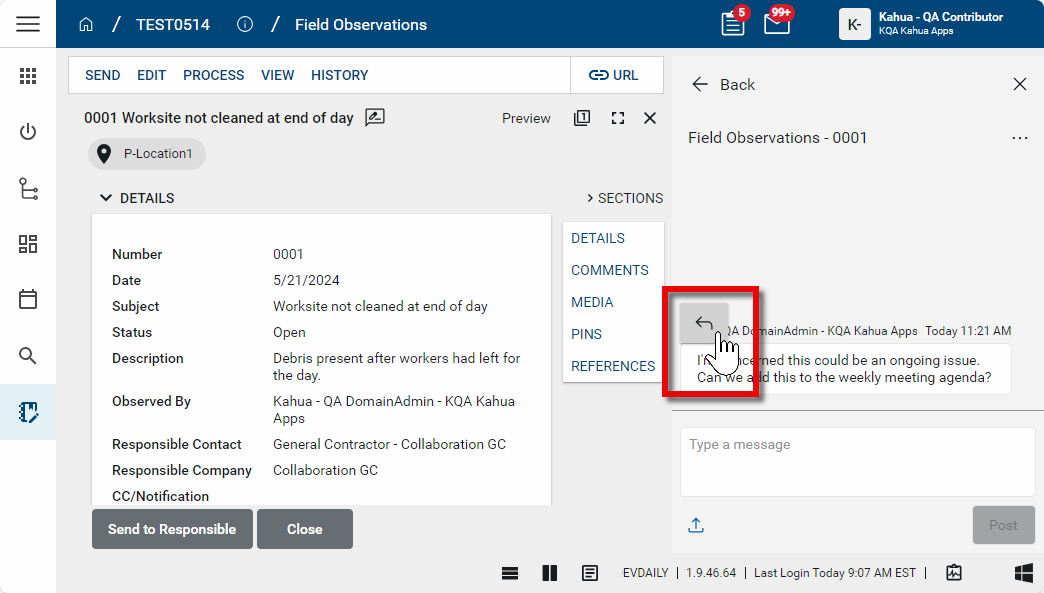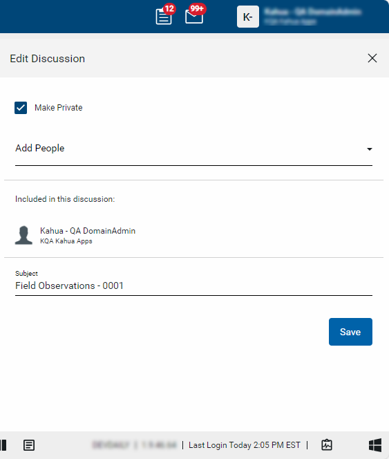 Depending on their notification settings, tagged users may receive a desktop notification or a Kahua message with a direct link to the discussion. Users who are not yet participants in the discussion will be added to the discussion. This applies to both public and private discussions. You do not have to be the creator of the discussion to add someone to a private discussion.