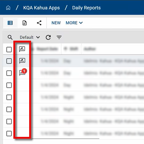A column on the app's Default log view indicates which records are associated with one or more discussions. The number of discussions with unread posts appears on the icon