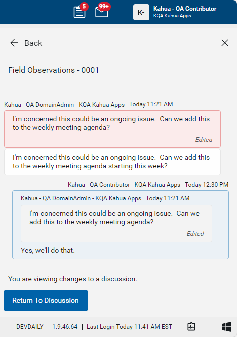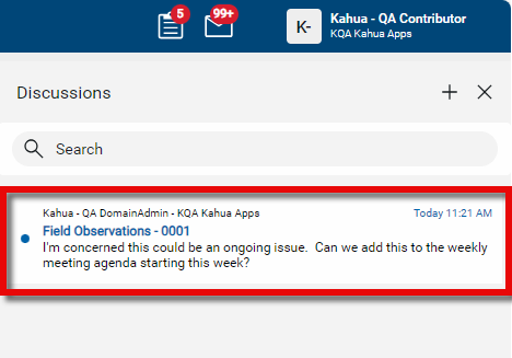 Discussions are a feature available in most Kahua applications (all hub applications), allowing users with access to those applications to start a public or private conversation associated with a specific record. Discussions can be used for any purpose. These threaded conversations become a permanent part of the record in Kahua, preventing them from being lost in emails or outside chat applications.