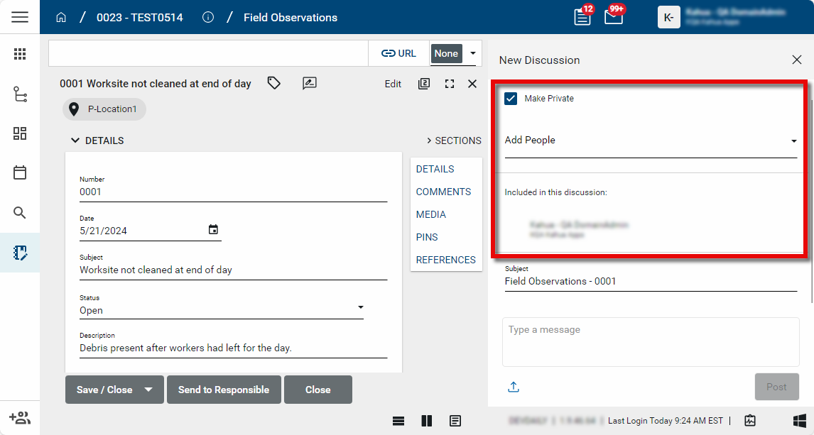 Select or clear Make Private to make the discussion private or public. If you select Make Private, add the appropriate users in the Add People field. Here you can also remove participants from private discussions. Modify the Subject field to change the name of the discussion.