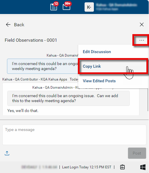 A link to a discussion can be copied and shared, allowing another Kahua user to quickly open the discussion directly. Alternatively, you can use the @mention feature to add a user to the discussion.