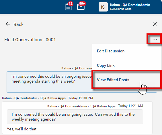 You have the ability to edit or delete your own posts in a discussion. The original posts are saved and can be viewed at any time by any user with access to the discussion by selecting View Edited Posts from the list of additional actions under the ellipsis icon