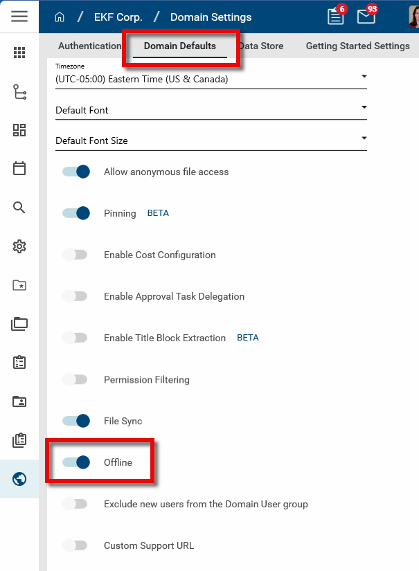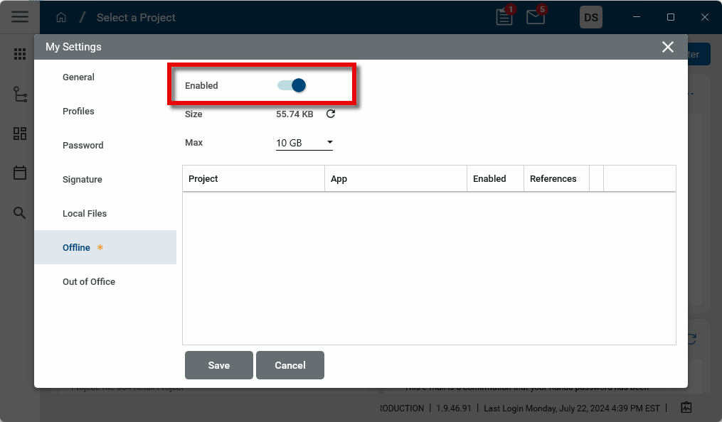 The feature must first be enabled in your domain by your domain administrator. Once enabled for your domain, each user who wants to use the feature must enable offline access for their own profile. Offline access can be enabled in the mobile host and the desktop host. Once enabled for a host, you must enable it for each combination of project and application where you intend to use it within that host.