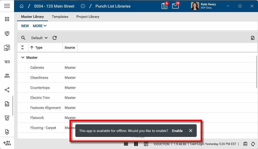If you do not enable it at this time, you will not be asked again. Instead, you can go to the My Settings > Offline tab and enable offline access for this and other combinations of project and application. Refer to Manage your Kahua Offline settings.