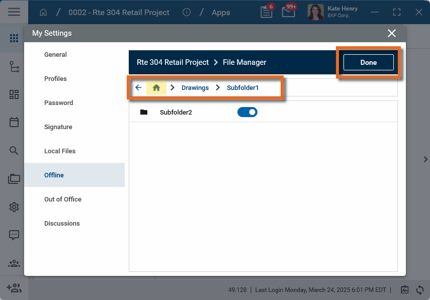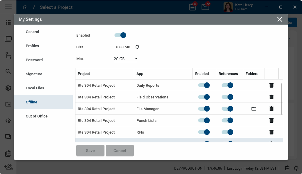 You can enable or disable the feature for each application and project combination and select whether or not to include reference files. For the File Manager app, you can select which project folders are included in the offline access feature.