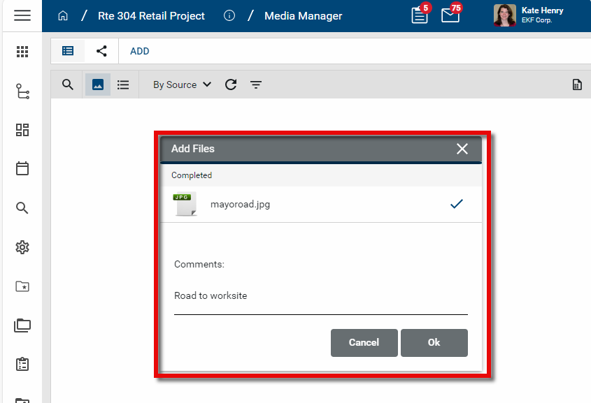 Once the file is ready, the Add Files dialog box appears. If desired, enter text in the Comment field. This text will be applied to the Caption field and appear as an overlay on the image in the thumbnail view. If there is no text added here, the Caption field will contain the file name. The Caption field can be edited from the detail view of the file. Click Ok to complete the upload.