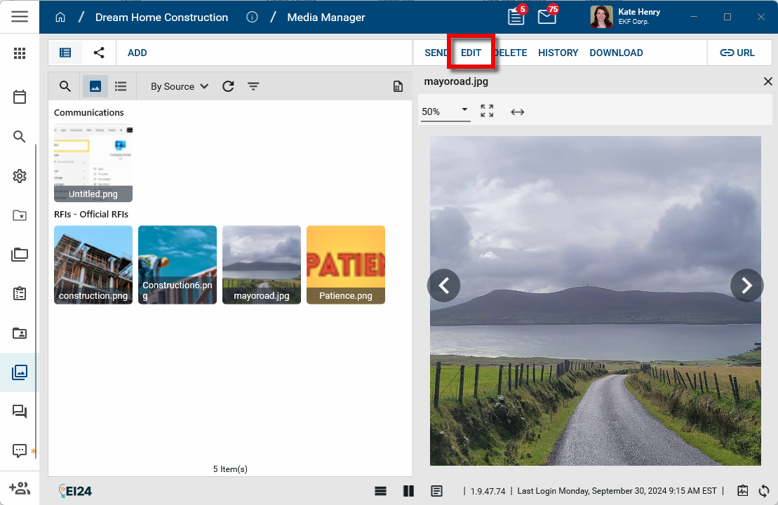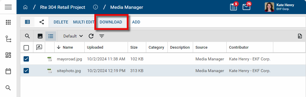 Several applications in Kahua have a Media section on their records. When users upload files to the media section of those records, the files appear in the Media Manager app. The Media Manager app serves as a central repository for all photos uploaded to the media section.