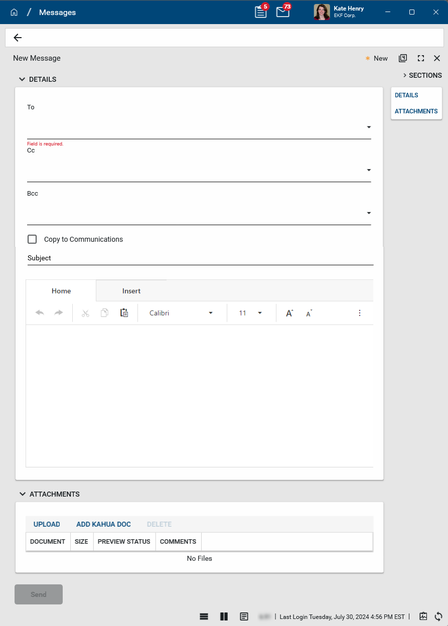Messages can be created and sent directly from the Messages app, or from records in applications throughout Kahua.