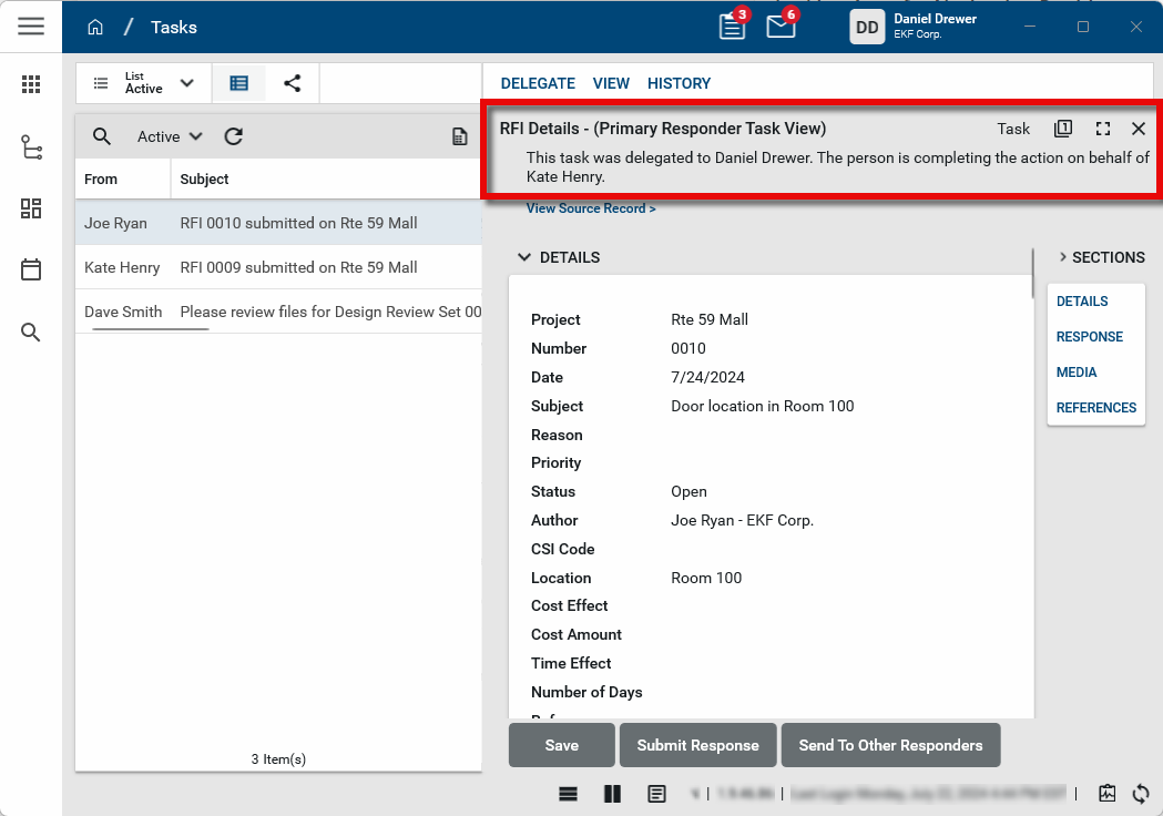 Some applications allow users to delegate, i.e. reassign, tasks to other users. If available, you can select Delegate from the action bar to reassign the tasks to another Kahua user. That user will be able to act on the task on your behalf. For more information, refer to Delegate a task to another user.