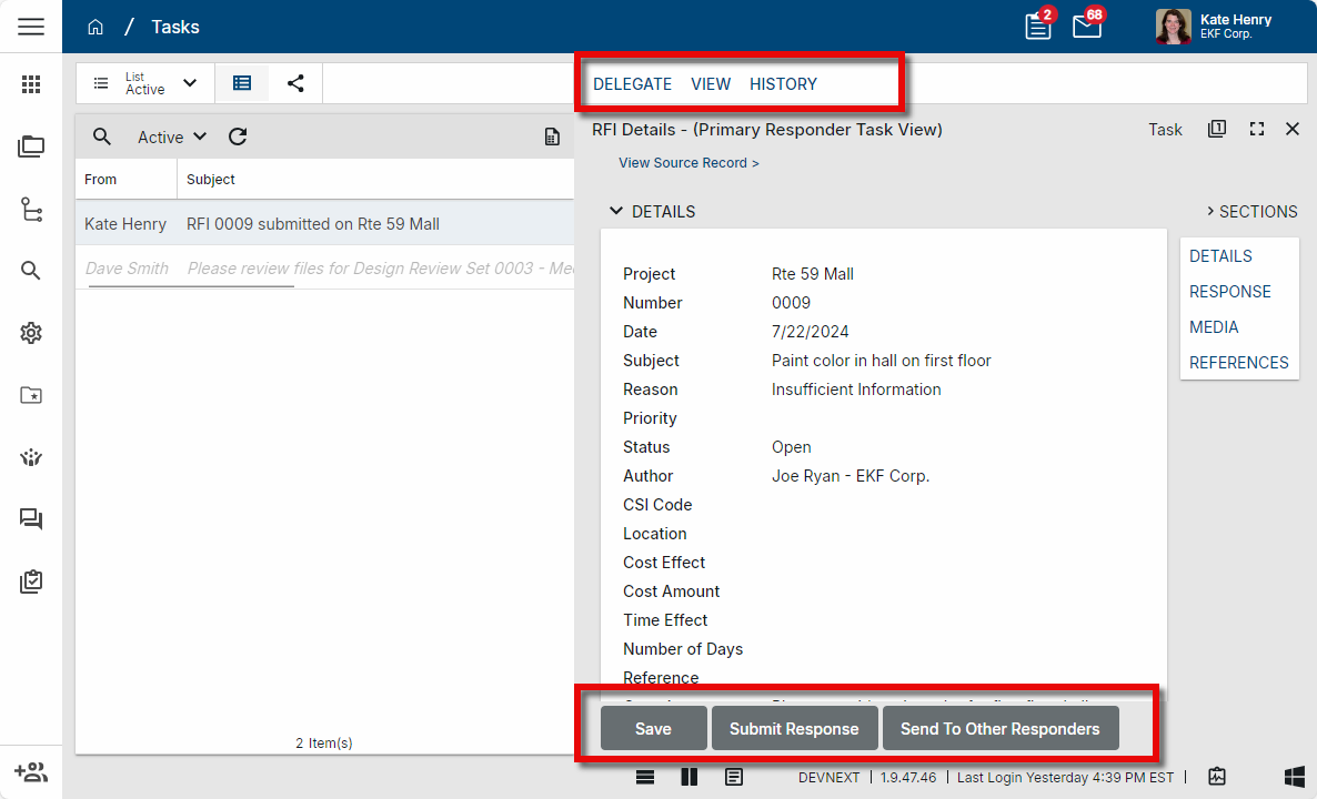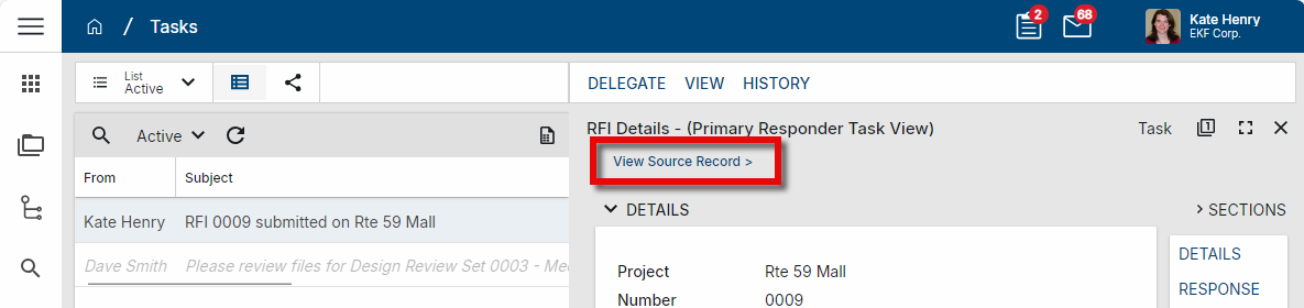 Review the task in the detail view. If desired, select View Source Record to review the underlying document for the task. For example, if the task is requesting a response to an RFI, you can select View Source Record to open the associated RFI in the RFI application.