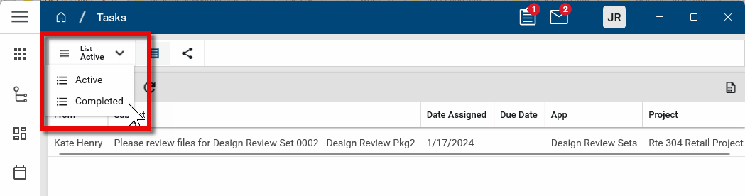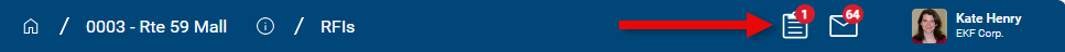 - Click on the tasks icon on the Kahua header to open the app. The number in red on the icon is the number of open tasks you have. -