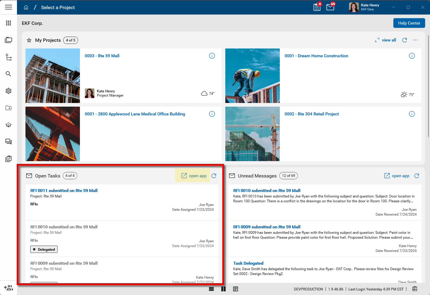 Open Tasks section of the Kahua Home page - Click on a task from the list of open tasks on the home page to open that task in the Tasks application. Alternatively, click open app from the section. For more information, refer to View Open Tasks.
