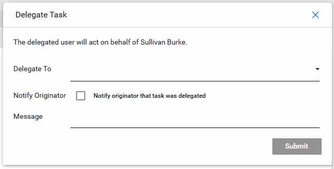 For most tasks, you have the option to delegate, i.e., reassign, the task to another user in your primary domain. For more information, refer to Delegating Tasks.