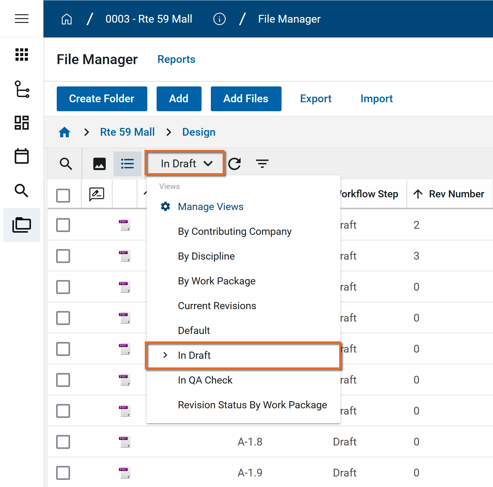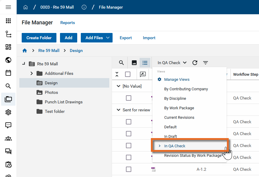 When drawings and documents are initially uploaded to a controlled folder, the Workflow Step will default to Draft. From the Draft status, they can go through a QA Check review process.
