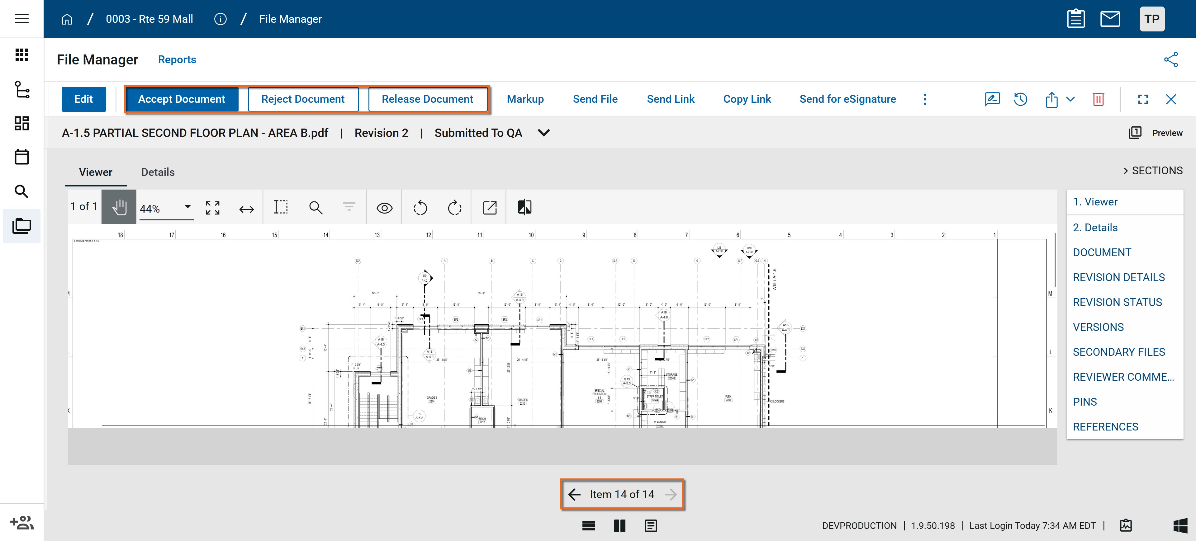 Accept Document - The document is accepted. Once accepted, it can either be processed as part of a Design Review set for official approval or released directly to the current set of revisions.