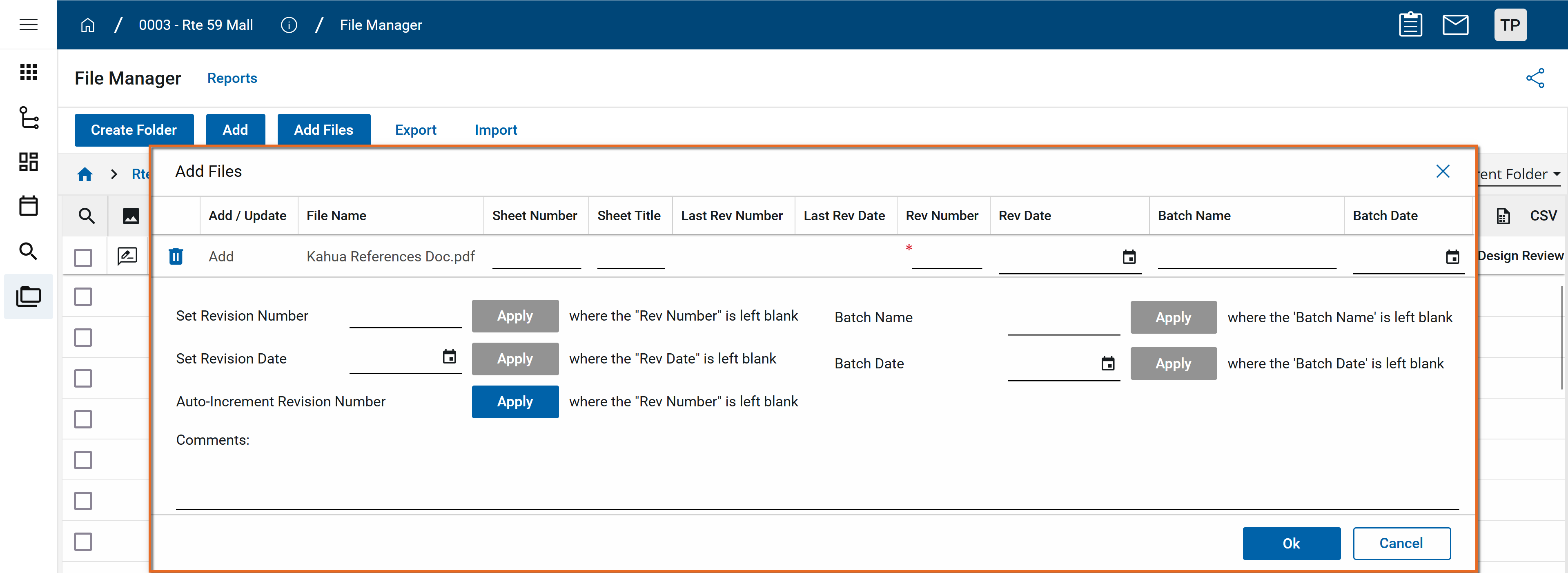 To upload a new revision, select New Revision. Enter the revision number, date, and comments if applicable. Click Ok.