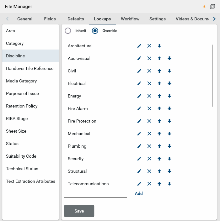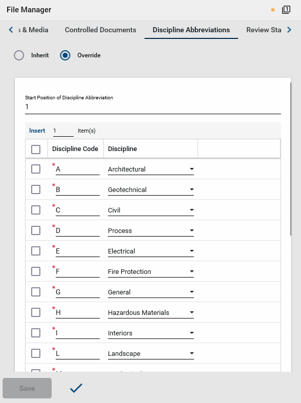 Ensure that all the disciplines represented in the drawing sets are included in the list of Discipline lookup values. This can be established at the project level (Apps > Administration > Configuration > Applications > File Manager > Lookups > Discipline), or the File Manager folder level (Folder Properties > Configuration > Lookups > Discipline). For more information, refer to Lookups.