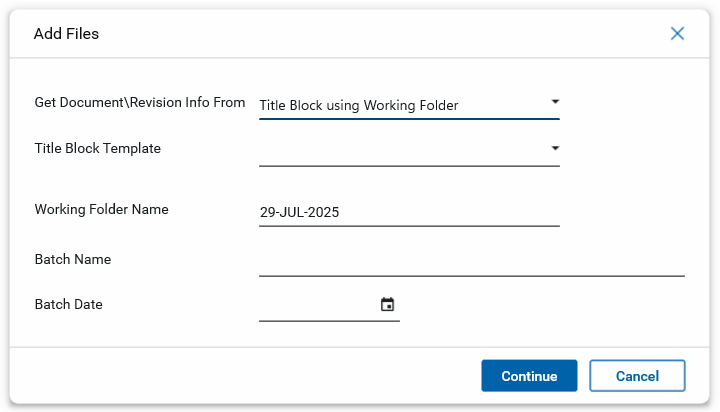 On the Add Files dialog, in the Get Document/Revision Info From field, select "Title Block using Working Folder".