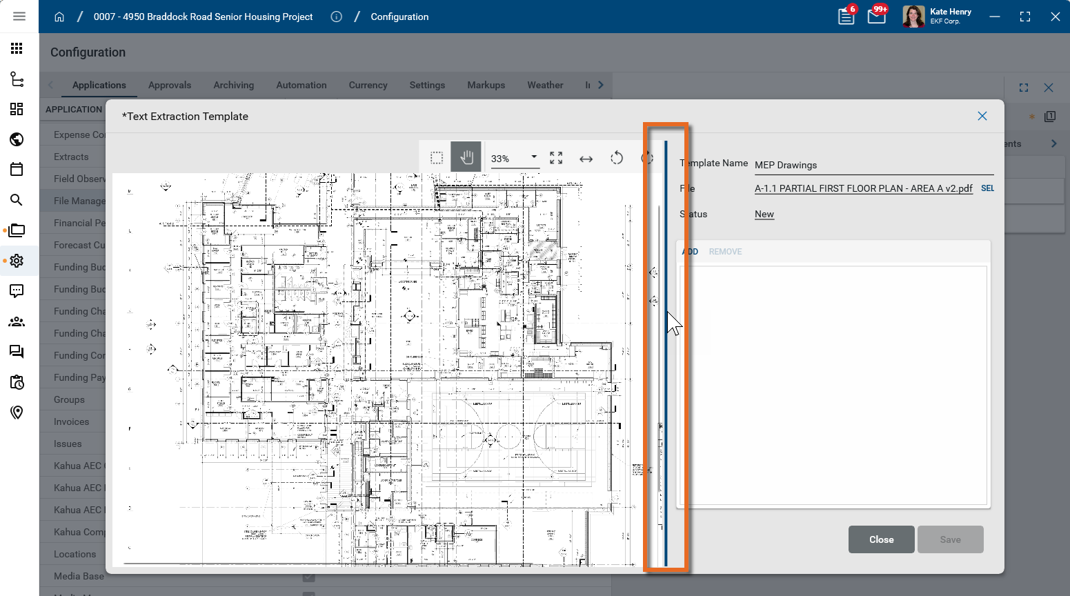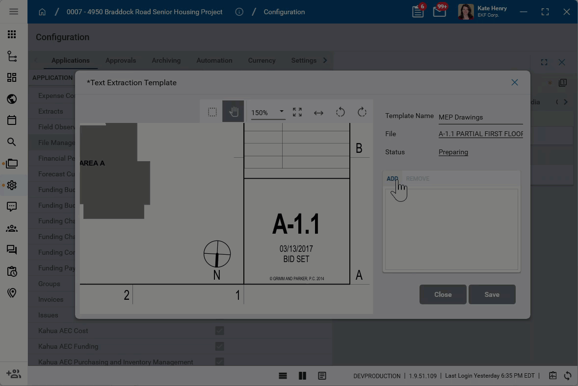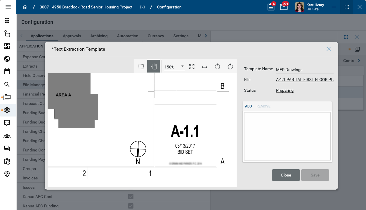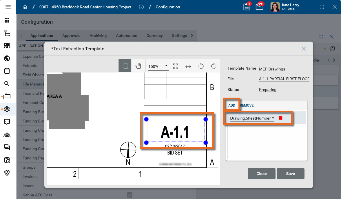 To properly extract this information, a template must be created. The purpose of the template is to define the mapping of areas of the title block to specific drawing attributes. Because each drawing set has the potential to have different title block arrangements, Kahua provides a way to create and manage multiple Title Block Templates. Different templates may be created for each contributing organization. For example, on a single a project there may be a need to have one template defined for the Architectural Drawing Sets (which come from the Architect), one for the Structural Drawing Sets (which come from the Structural Design Team), and one for the MEP Drawing Sets (which comes from the MEP Design Team).