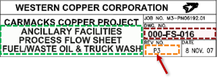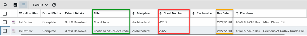 Example The example below shows how the Title Block Extraction process correctly extracted the Sheet Number (in red), the Sheet Title (in green), the Revision Date (in gold), and the Discipline (by inference, using the first character of the Sheet Number).