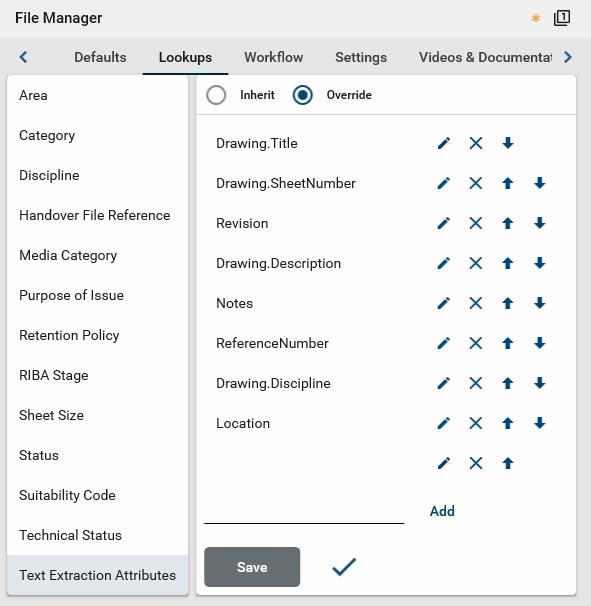 Review the attributes that you want to map from the title block. Ensure that they are all available as Text Extraction Attributes. This can be established at the project level (Apps > Administration > Configuration > Applications > File Manager > Lookups > Text Extraction Attributes), or the File Manager folder level (Folder Properties > Configuration > Lookups > Text Extraction Attributes). For more information, refer to Lookups.