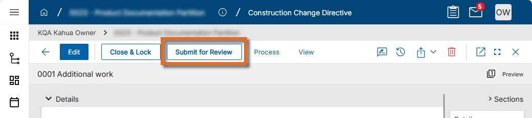If configured appropriately, you can submit the Construction Change Directive for review. It is sent as a task to the user designated in the approval configuration.